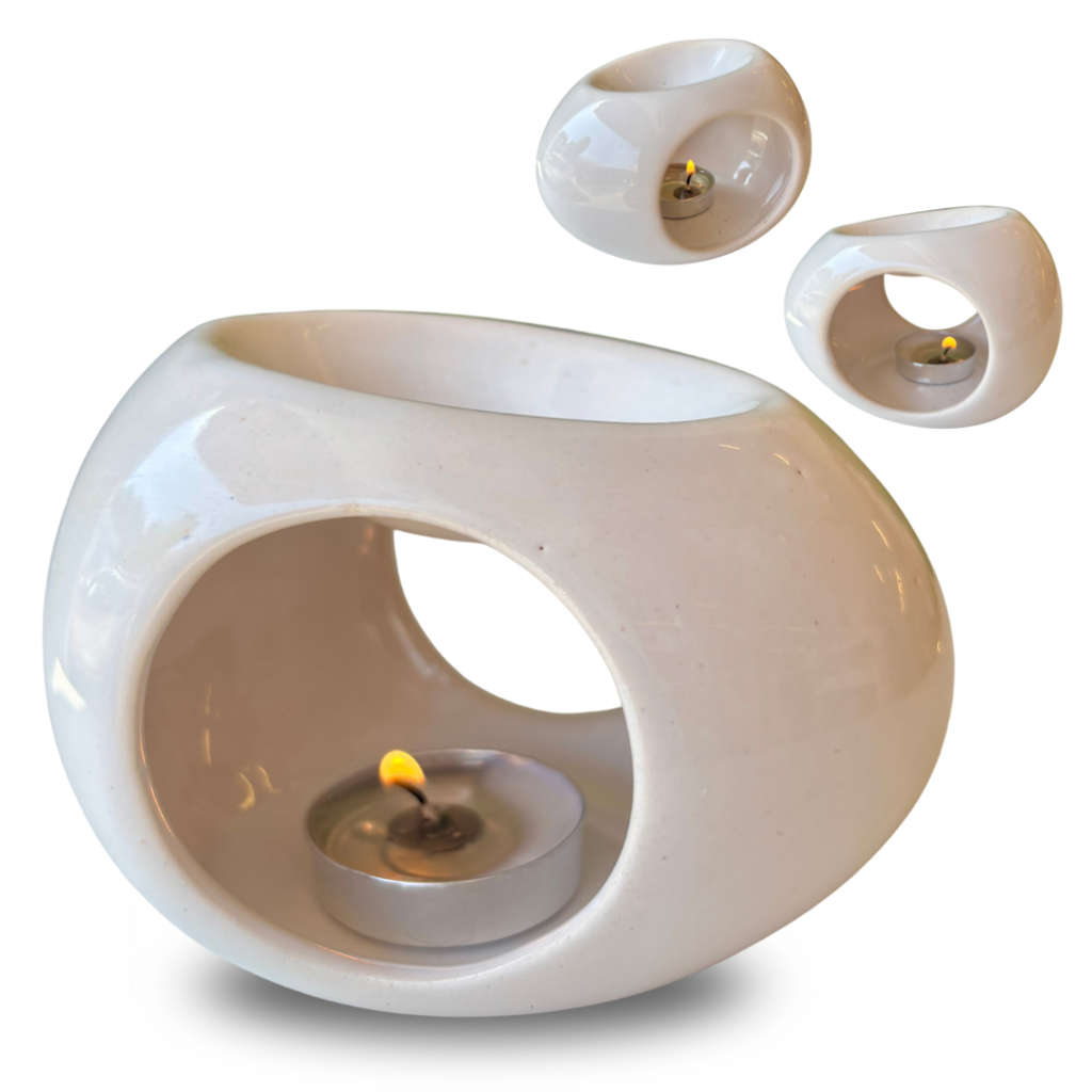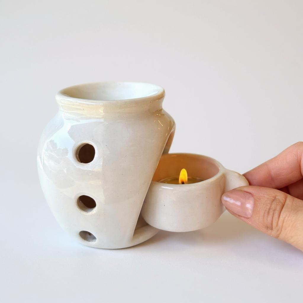 Nossos réchauds de cerâmica estão disponíveis em quatro modelos encantadores – Vasinho, Flor, Vazado e Buda – todos com acabamento artesanal e design pensado para valorizar sua decoração. Basta acender a vela sem perfume no compartimento inferior para aquecer essências ou pastilhas aromáticas, liberando o aroma pelo ambiente e criando um clima relaxante. Ideal para sair da rotina e criar momentos de bem-estar.