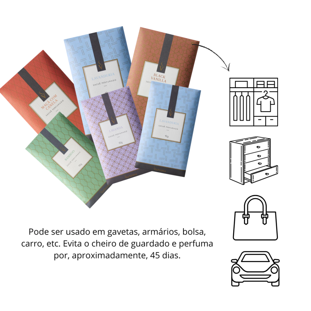 Os sachês Via Aroma de 10g cabem em todos os cantinhos, gavetas, caixas, armários e até no carro. Após aberto, o aroma se desprende do papel poroso e começa a se espalhar pelo ambiente, aderindo a tecidos e no espaço de forma geral. Traz elegância e sensações de bem-estar ao seu lar. Escolha seu sachê preferido e aproveite! Basta retirar do plástico. Tem uma duração aproximada de 45 dias, dependendo do ambiente e condições de uso.